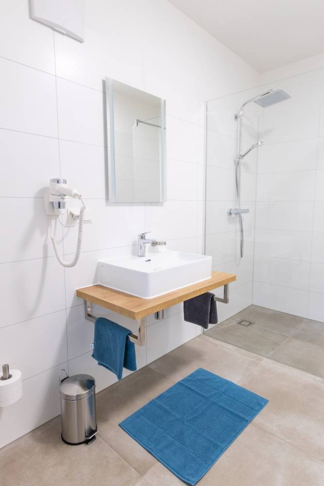 Willkommen im Apartment Ostwind - einem Rückzugsort mit blauen Akzenten, die an klare Himmel und frische Morgenluft erinnern. Das großzügige Fenster lässt viel Tageslicht herein und eröffnet den Raum für Ruhe, Leichtigkeit und Inspiration.